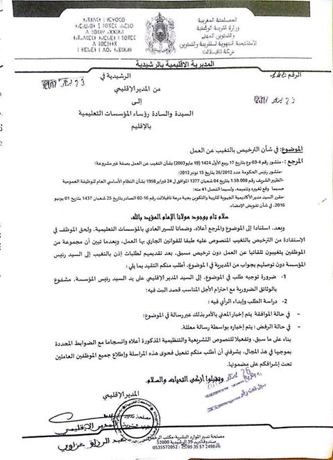 مراسلة السيد وزير التربية الوطنية حول الترخيص بالتغيب