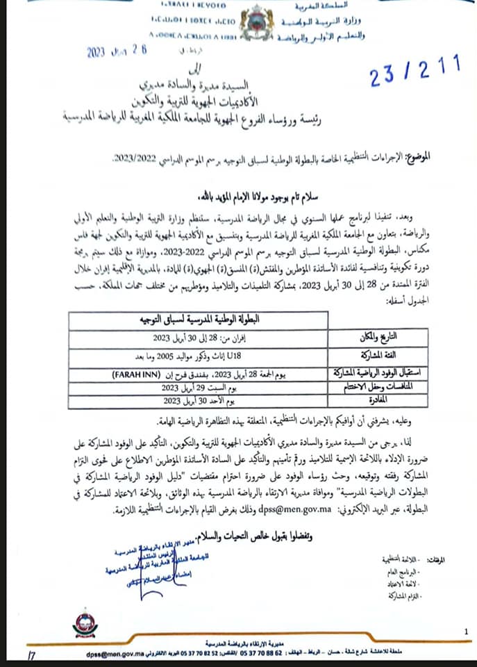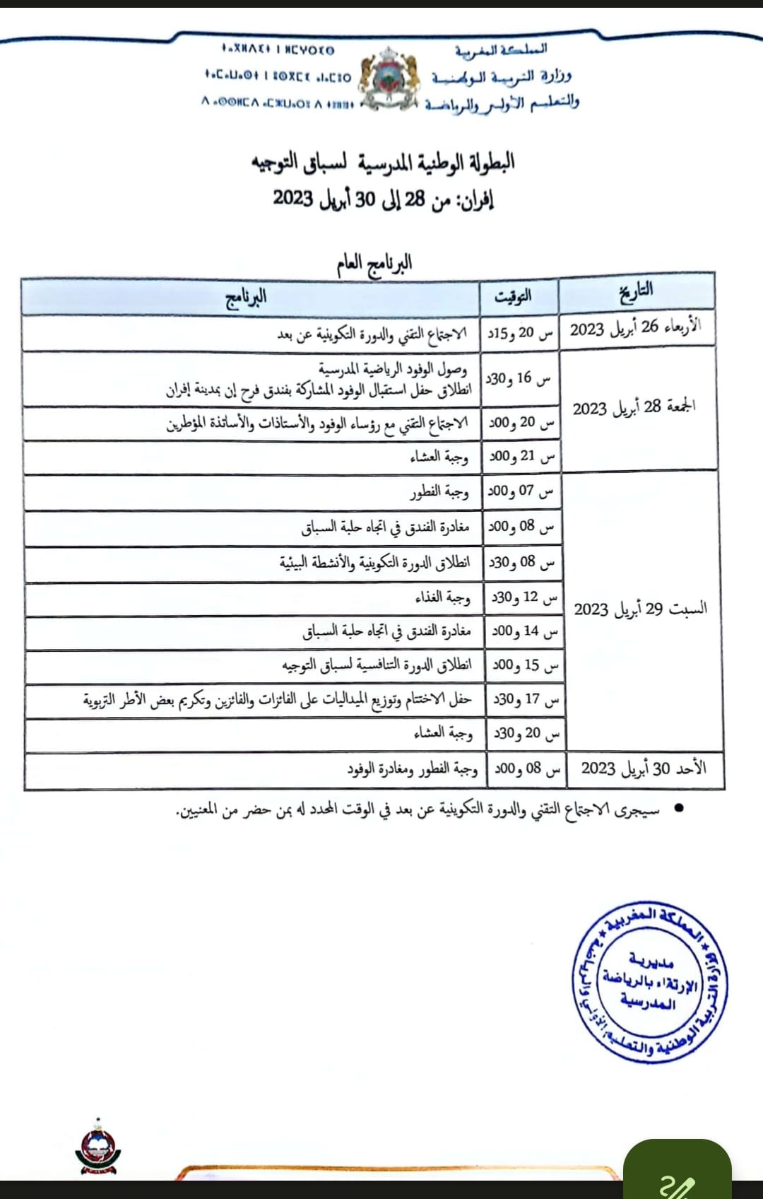 1. افتراضي تستعد مدينة افران لاحتضان فعاليات البطولة الوطنية المدرسية لسباق التوجيه للذكور و الانا ث، المنظمة تحت شعار “التلميذة والتلميذ في صلب الارتقاء بالرياضة المدرسية” مع الاجراءات التنظيمية للبطولة
