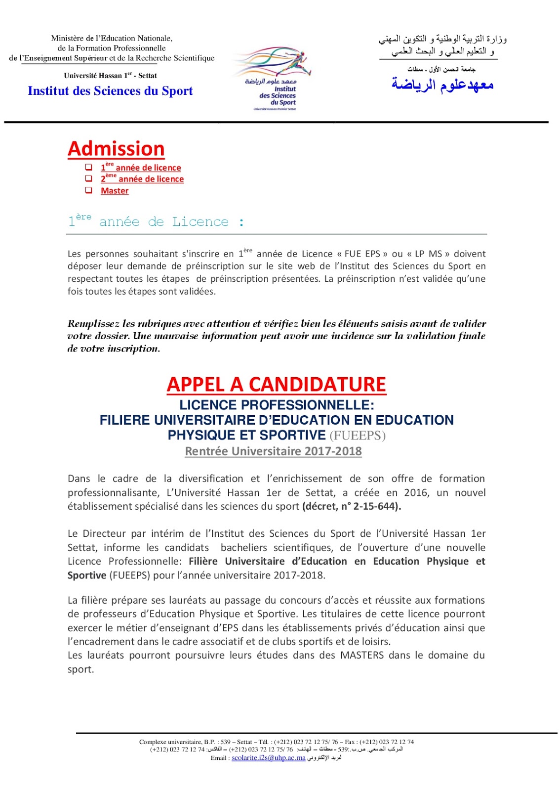 معهد علوم الرياضة بسطات مباراة ولوج السنة الاولى من الاجازة المهنية في التربية البدنية و الرياضة آخر آجل 20 يوليوز 2017