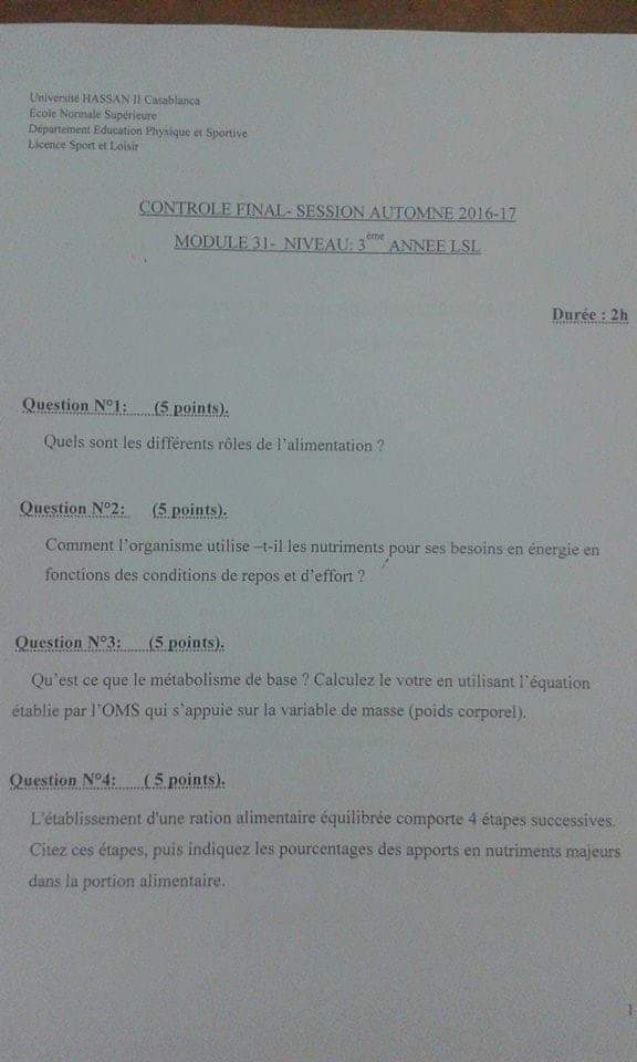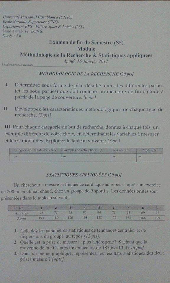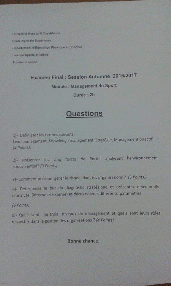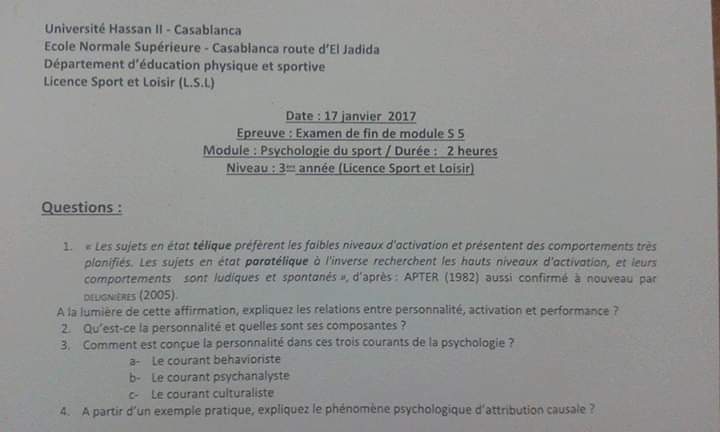 les examens du 5 semestre licence Sport et Loisirs session Janvier 2017.