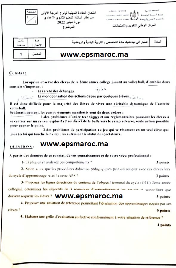 مواضيع امتحان الكفاءة المهنية فِي مادة التربية البدنية و الرياضية لِوُلُوجِ الدرجة الأُوْلَى من إطار أساتذة التَّعْلِيم الثانوي الاعدادي دورة دجنبر 2022